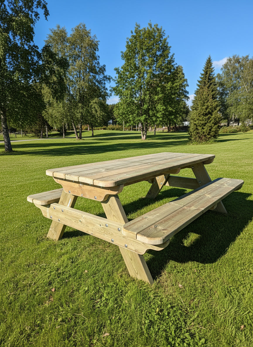 Piknikbord, piknikbenk, parkbenk, rastebenk.. Kjært barn har mange navn, og de fleste ser like ut – men vårt skiller seg ut. Proposjonene er nøye gjennomtenkt: setene har riktig høyde både for barn og voksne, bordplaten er bred nok til familiemiddager, og kantene er glatte og behagelige. Utseendet er klassisk, men med raffinerte detaljer du legger merke til både på avstand og hver gang du setter deg ved bordet.
